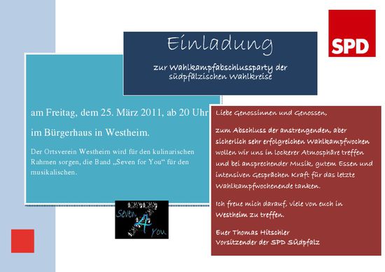 Am 25. März finden landesweite Wahlkreispartys zum Schlussspurt des Wahlkampfes statt. In der Südpfalz steigt eine gemeinsame große Party im Bürgerhaus Westheim mit den Landtagsabgeordneten Barbara Schleicher-Rothmund und Wolfgang Schwarz. Beginn ist 20:00 Uhr. Es gibt ein buntes Programm mit der Band "Seven 4 You" und Live-Schaltungen aus Mainz.