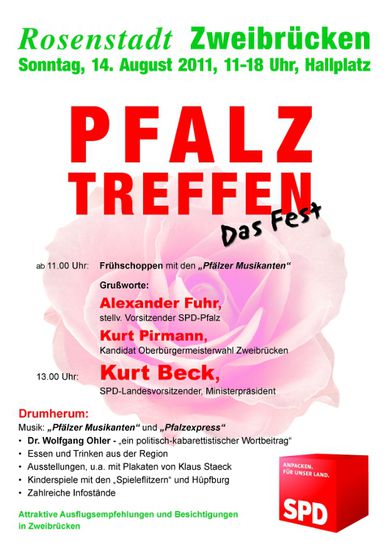 Wie jedes Jahr, feiern die Sozialdemokratinnen und Sozialdemokraten der Pfalz und ihre Freunde ein Fest. In diesem Jahr richten die Genossinnen und Genossen der Rosenstadt Zweibrücken die Veranstaltung aus.