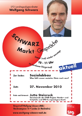 Zum Thema „Sozialabbau – Was hält unser soziales Netz noch aus?“ hat er am Samstag, 27. November 2010, von 10.00 Uhr bis 11.00 Uhr, die Vorsitzende des DGB Region Vorder- und Südpfalz und Europaabgeordnete Jutta Steinruck eingeladen.